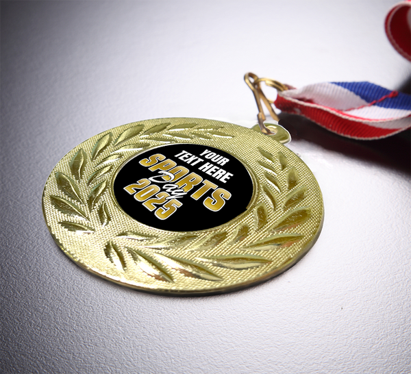 Great quality embossed metal 50mm medal. The price includes your School Name Sports Day 2025 design flat centre and your choice of ribbon.