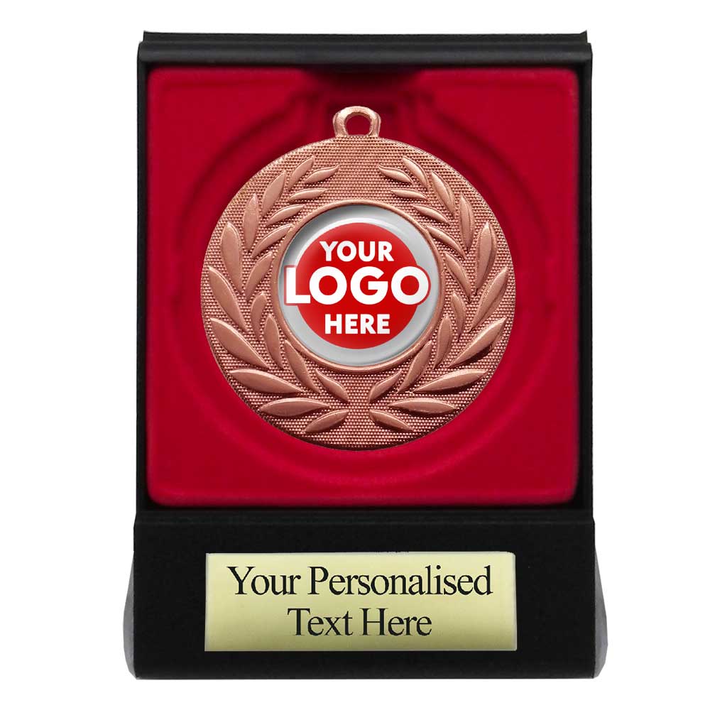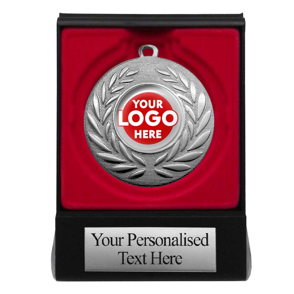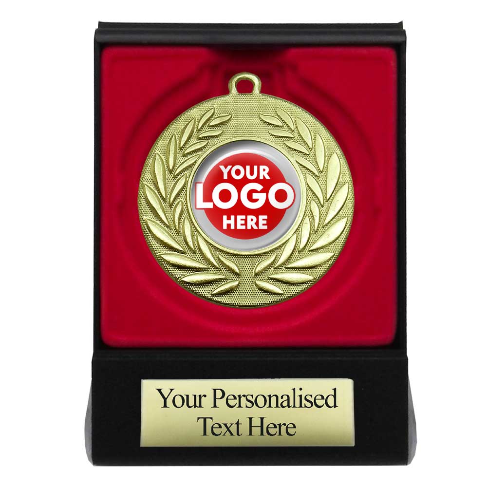 Great quality metal embossed 50mm Wreath medal in high quality plastic flipover design box. The price includes your choice of centre and personalised sticker plate.
