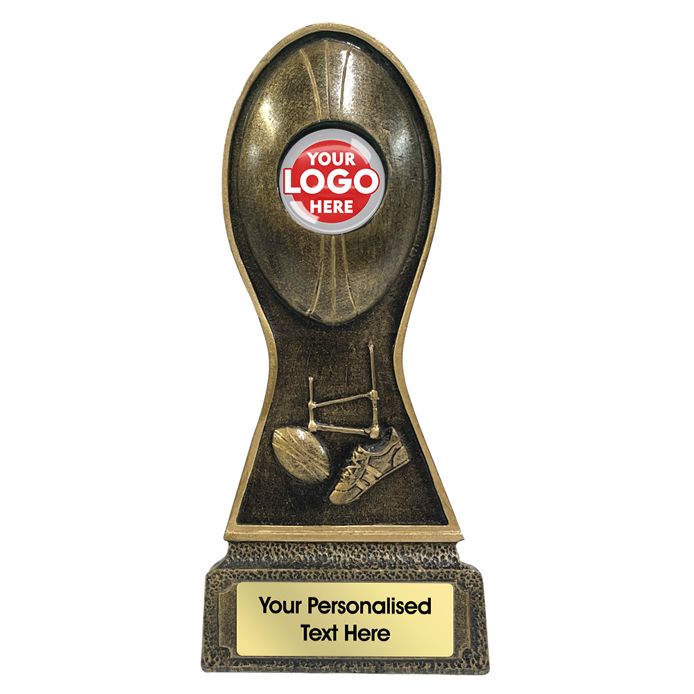 Standing at 155mm tall, this elegant trophy features a sculpted rugby ball and boot design finished in rich antique gold tones. Made from high-quality resin for durability and style, it includes a custom logo area for your club or event emblem and a free printed personalised nameplate, with an option to upgrade to an engraved metal plate.