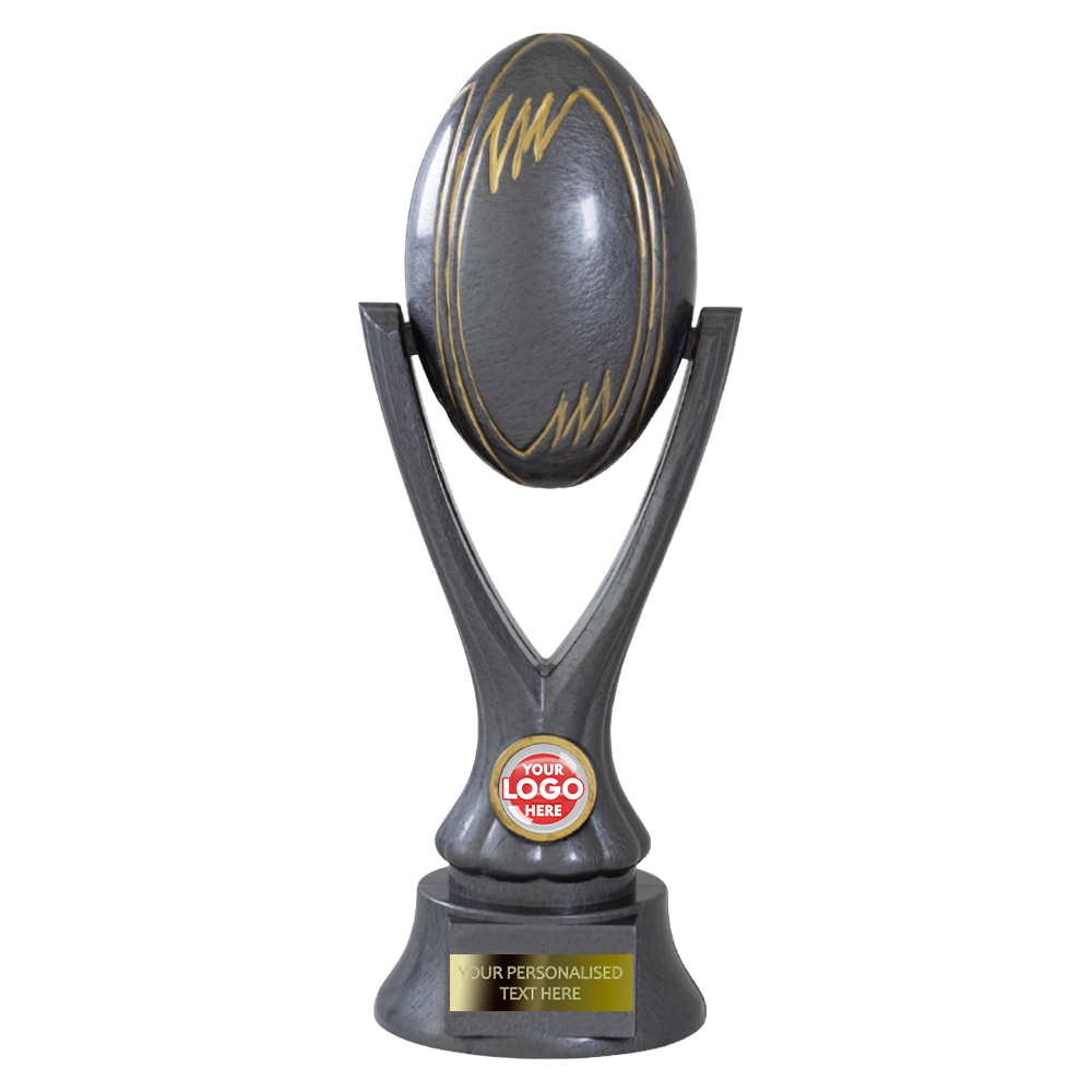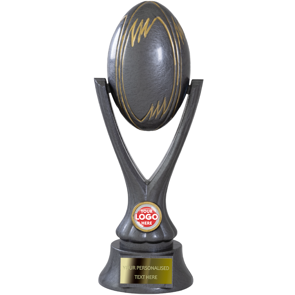 A stylish antique silver coloured rugby ball on stand with golden decoration, suitable for any event or occasion. Includes Free logo and engraved metal plate.