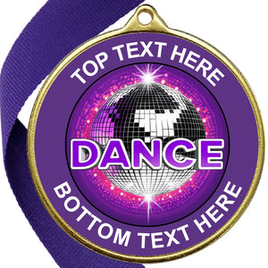 A gold 50mm Metal medal with a full size custom printed vinyl centre with your chosen Dance design along with a 22mm woven ribbon.