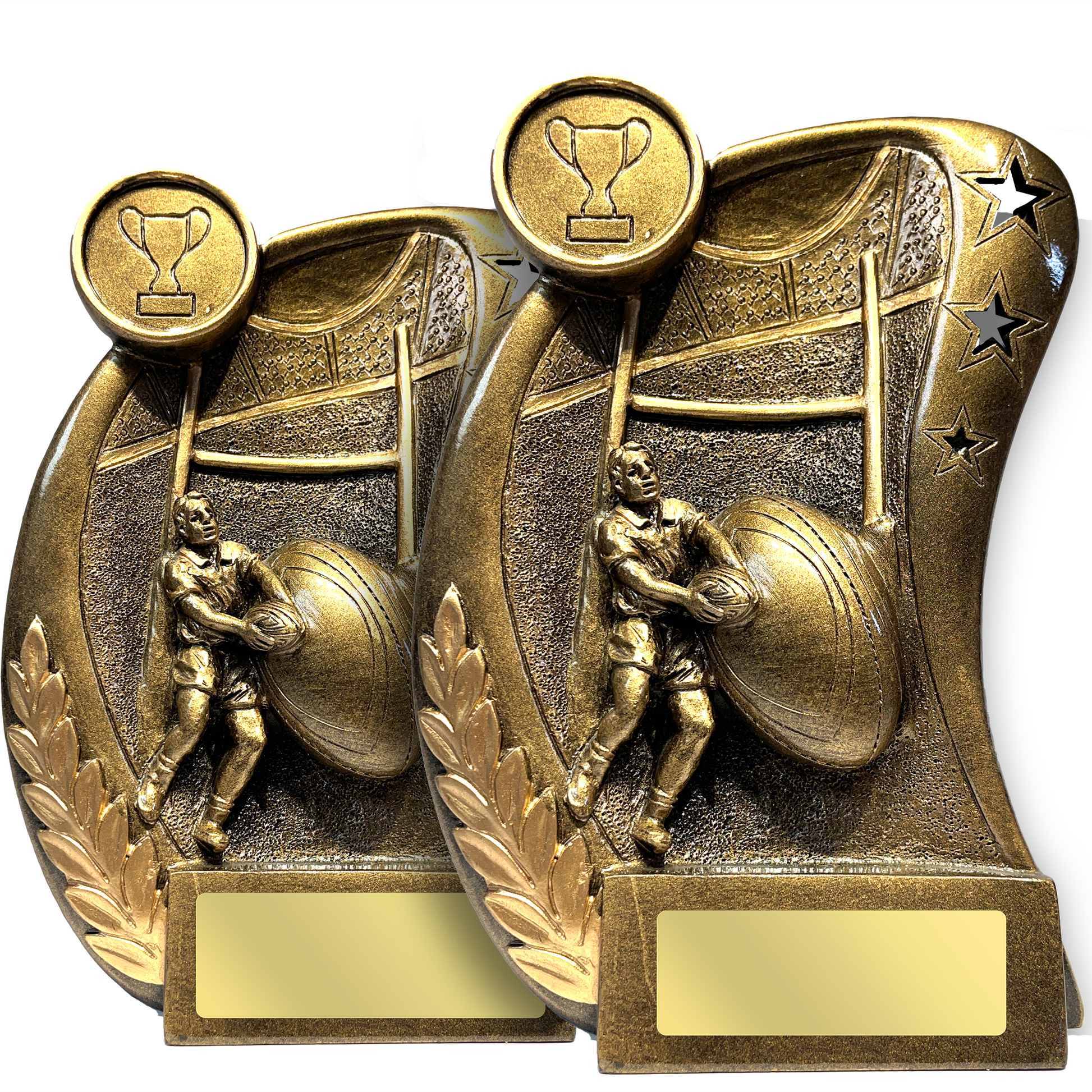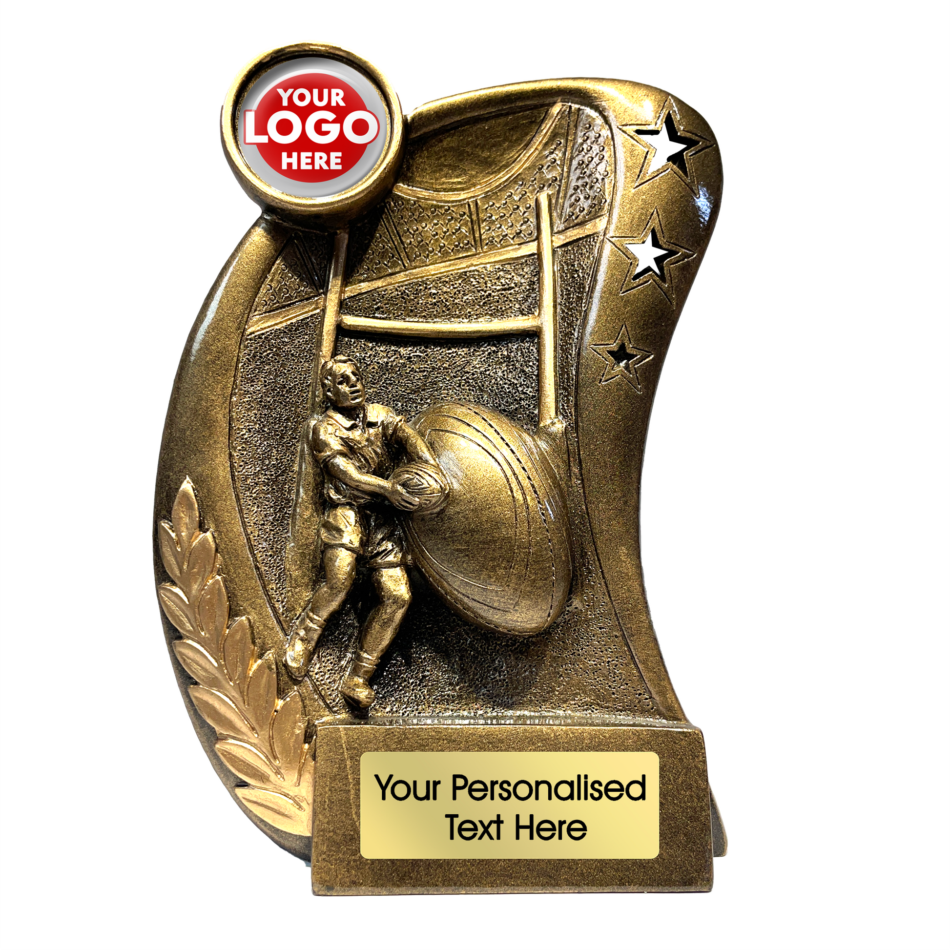 Celebrate rugby excellence with the Gold Rugby Trophy – featuring a detailed player in action with a classic goalpost backdrop. Made from high-quality antique gold resin, it includes a free personalised text plate for a unique finishing touch.