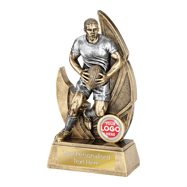 Rugby player figurine resin award, suitable for any event or occasion. Includes Free engraved text plate and logo insert of your choice.