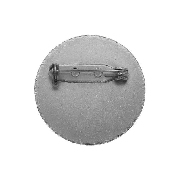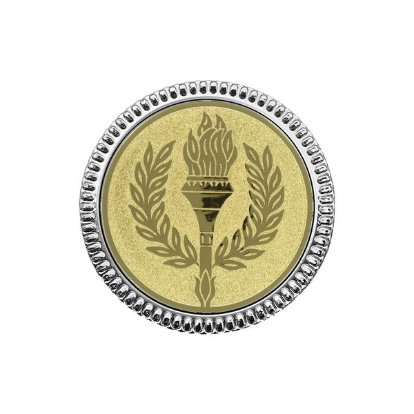 Gold or SIlver steel pin badge with decorative edge and safety catch on the reverse. The size is 30mm in diameter taking a 25mm centre insert. It comes complete with gold victory torch centre insert.