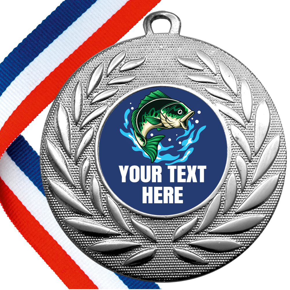 'Wreath' Design 50mm Metal Medals With Personalised Fishing Centre Inserts on your choice of 22mm woven Ribbons.
