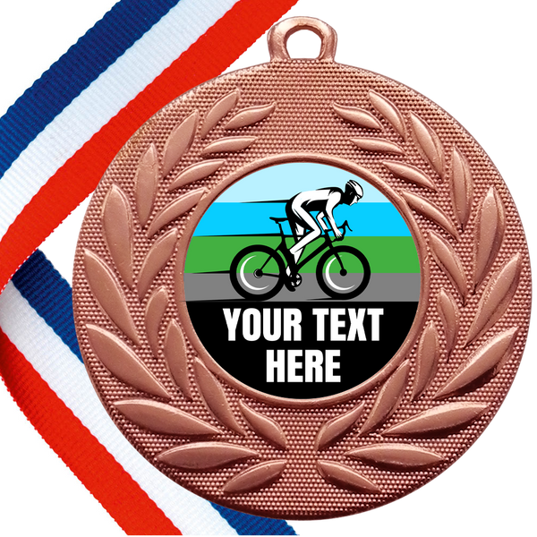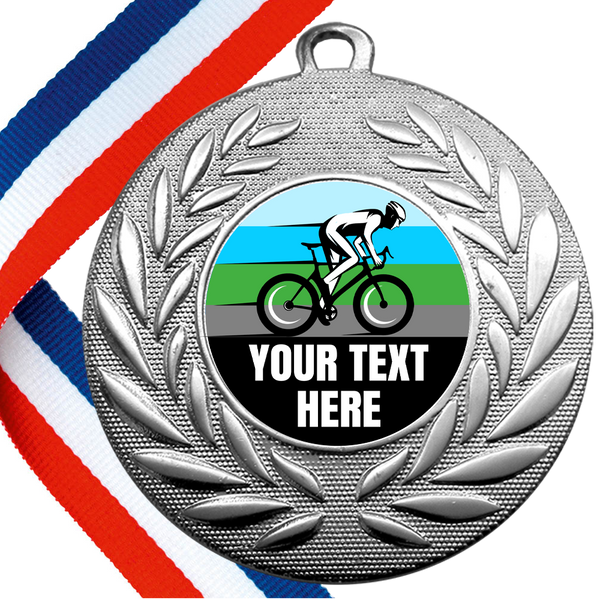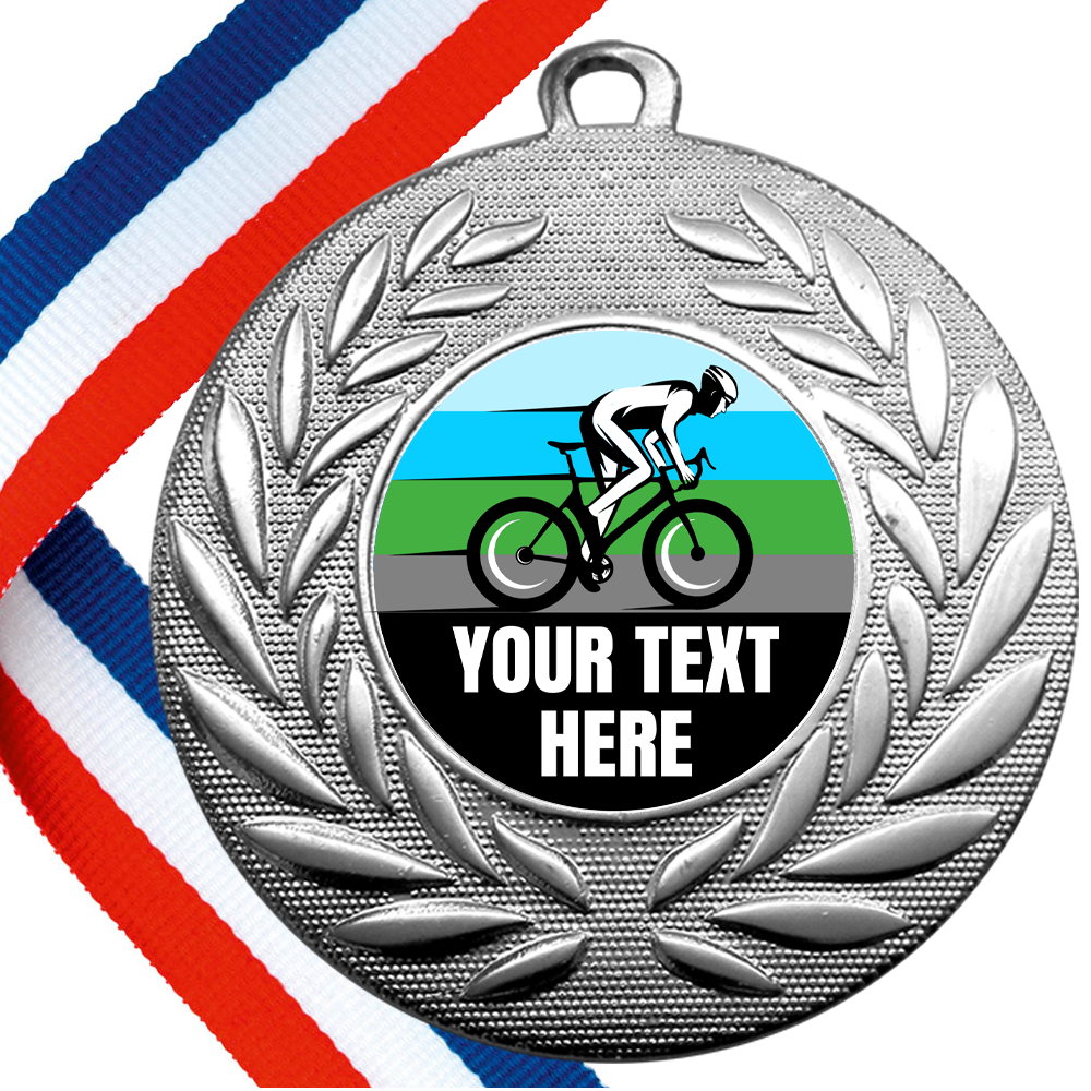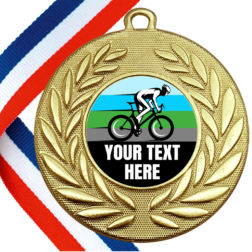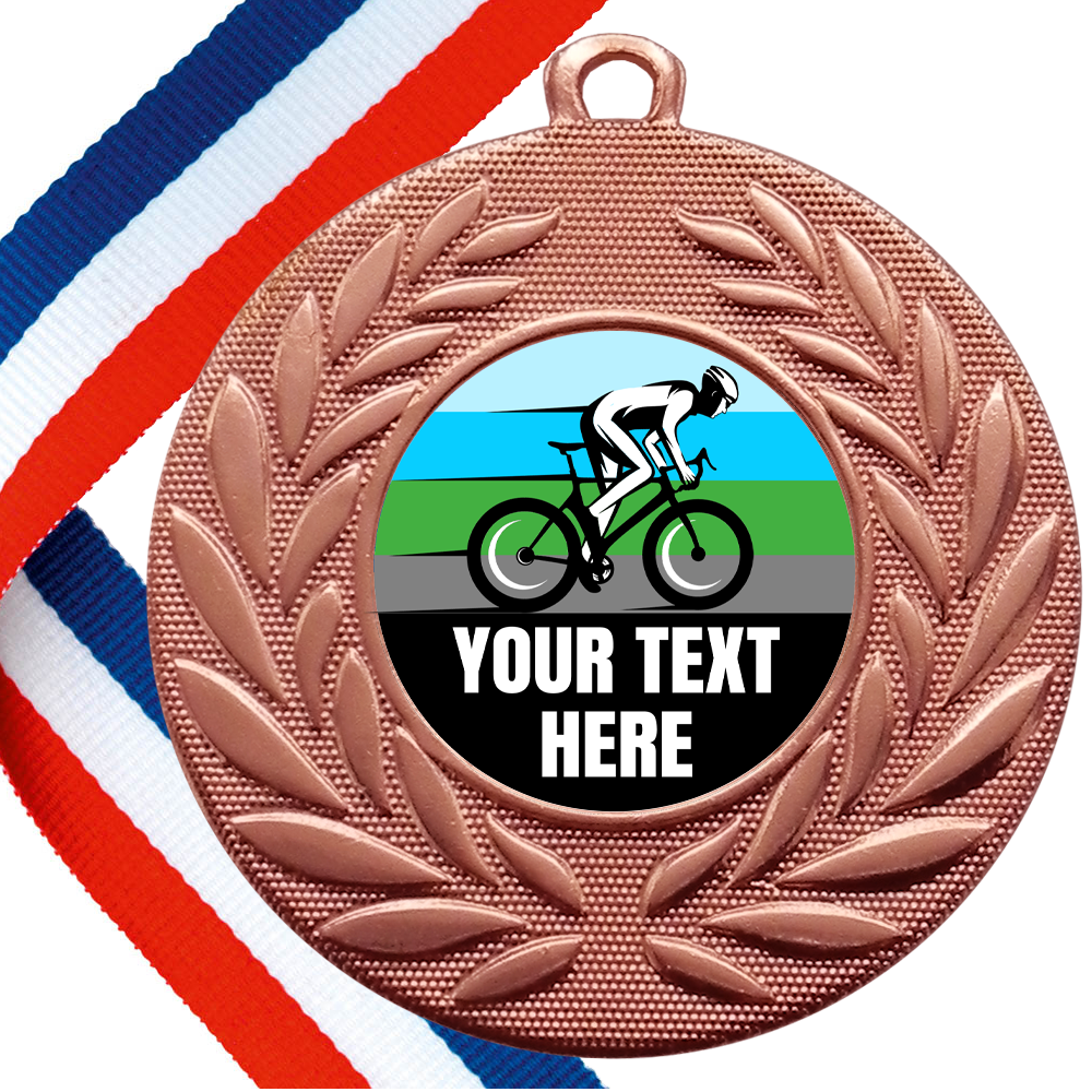 'Wreath' Design 50mm Metal Medals With Personalised Road Bike Centre Inserts on your choice of 22mm woven Ribbons.