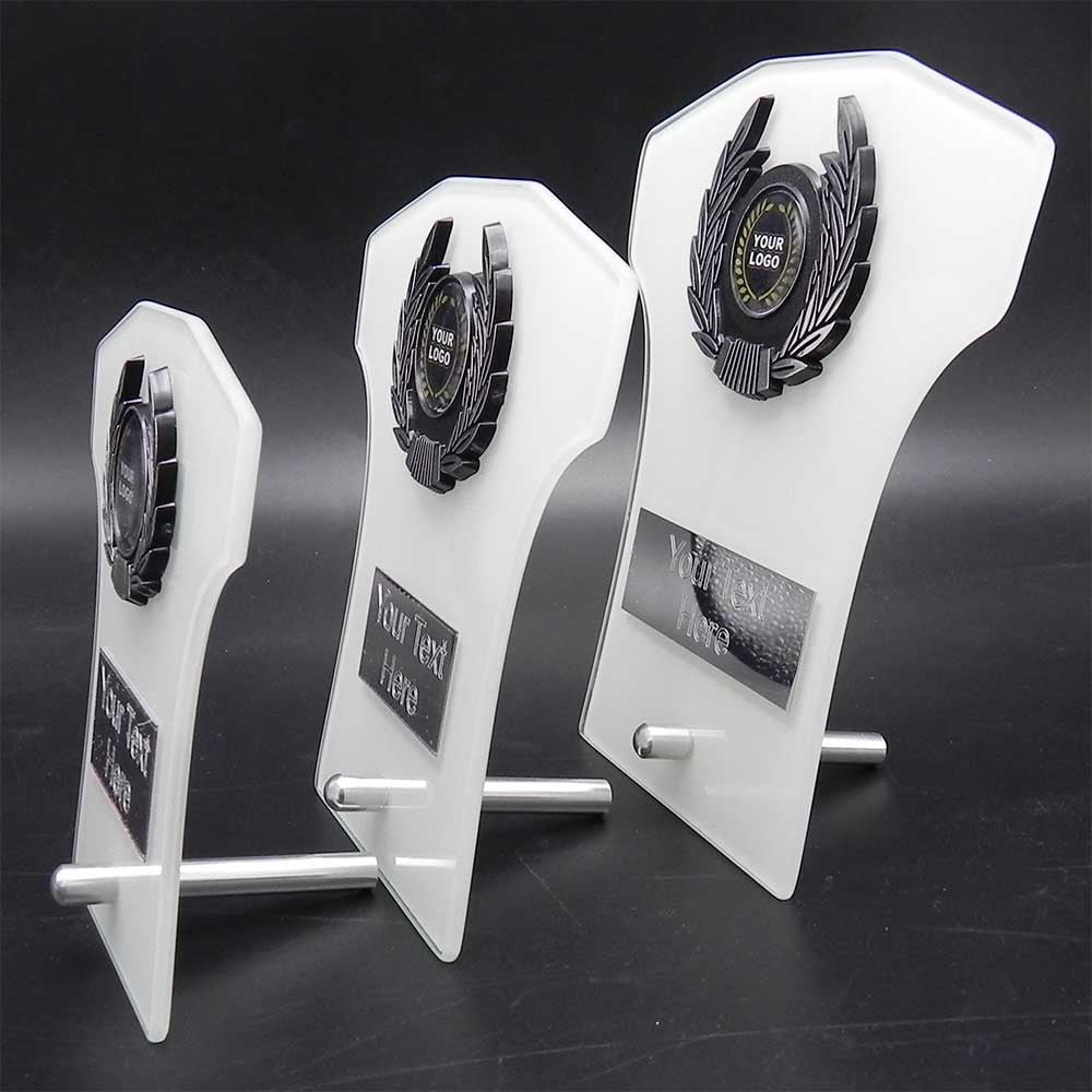 A glass opaque trophy with stand.