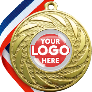 Great quality embossed metal 50mm medal. The price includes logo centre with gel dome on top of it and free ribbon.